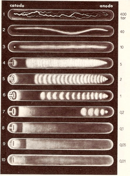 Un riassunto di cosa si osserva in un tubo contenente gas rarefatto, al diminuire della pressione [l’unità di pressione nel sistema SI è il pascal (Pa), che corrisponde a 1N/m2. Qui è riportata l’unità tor che equivale a 133,322 pascal], è riportato nelle figure seguenti: