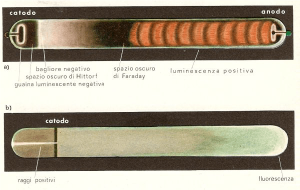 ulteriormente la pressione del gas, la luce positiva tende a sparire, con la zona oscura di Faraday che occupa quasi l’intero tubo, ma inizia ad apparire una notevole fluorescenza lungo quasi l’intero tubo. Questo fenomeno fu studiato a