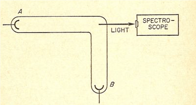 In tale memoria Goldstein si occupò anche di realizzare la misura dell’effetto Doppler tentata da Tait mediante la misura con uno spettroscopio della posizione delle linee spettrali emesse dal supposto torrente molecolare. Allo scopo si fece costruire un tubo a forma di L, come quello di figura in cui ciascun elettrodo poteva servire come catodo.