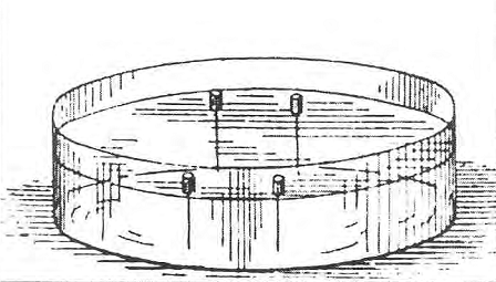 In questo esperimento un. certo numero di piccoli magneti si fanno galleggiare in un catino d’acqua. I magneti sono aghi di acciaio magnetizzato di ugual forza e si fanno galleggiare essendo infilati in piccoli dischi di sughero. I magneti sono posti in modo che i poli positivi siano o tutti sopra o tutti sotto la superficie dell’acqua. Questi positivi come i corpuscoli, si respingono tra loro con forze che variano inversamente con la distanza tra di essi. La forza attrattiva è fornita da un polo negativo (se i piccoli magneti hanno i poli positivi al di sopra dell’acqua) sospeso ad una certa distanza sopra la superficie dell’acqua. Questo polo eserciterà sui poli positivi dei piccoli magneti galleggianti una forza attrattiva la cui componente, parallela alla superficie dell’acqua, sarà radiale, diretta verso O, la proiezione del polo negativo sulla superficie dell’acqua, e se il polo negativo e ad una qualche distanza sulla superficie la componente della forza verso O sarà approssimativamente proporzionale alla distanza da O. Quindi le forze sui poli dei magneti galleggianti saranno molto simili a quelle che agiscono sui corpuscoli del nostro ipotetico atomo; la maggiore differenza è che i corpuscoli sono liberi di muoversi in tutte le direzioni dello spazio mentre i poli dei magneti galleggianti sono vincolati a muoversi in un piano parallelo alla superficie dell’acqua.