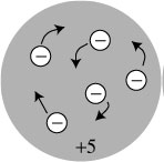 Il modello di Thomson chiamato Plum-Pudding nel caso di 5 elettroni. La parte grigia è carica di elettricità positiva equivalente a quella dei 5 elettroni.