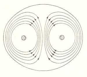 Il profilo convesso di un vortice doppio costituito da due vortici retti, paralleli, infinitamente lunghi e dotati di rotazioni uguali di senso opposto. In figura sono anche rappresentate le linee del moto del fluido trasportato dal vortice.