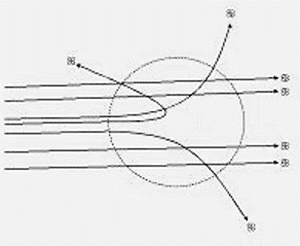 Nei circoli scientifici che si occupavano dei problemi originati dalla radioattività, e particolarmente negli ambienti britannici in cui l’influenza di J.J. Thomson era grande a seguito del suo prestigio, si era accettato il modello atomico che lo stesso Thomson aveva proposto nel 1904, cioè alcuni elettroni all’interno di una uniforme carica negativa gelatinosa, evanescente. Se si considerava allora una fogliolina di una sostanza (ad esempio, oro) e si sparava su di essa con delle particelle α ci si sarebbe dovuto aspettare che tutte le particelle attraversassero l’ostacolo per poterle ritrovare al di là della fogliolina d’oro. Non vi era infatti alcun ostacolo duro dentro gli atomi che costituivano il materiale in considerazione e gli elettroni erano ben poca cosa rispetto ai possenti raggi α. Questi ultimi erano cariche positive molto grandi al confronto della carica negativa dell’elettrone. L’urto meccanico sarebbe stato poca cosa, l’urto coulombiano avrebbe potuto vedere leggere deviazioni delle particelle α dalle loro traiettorie rettilinee. Ci si aspettava più o meno quanto mostrato nella figura seguente per un singolo atomo e quanto mostrato nella successiva per la deviazione massima di una particella α