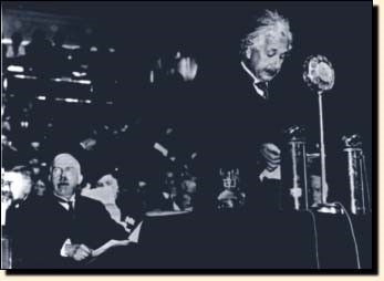 Nell’ottobre del 1933 Einstein, in una manifestazione tenuta a Londra, chiede il sostegno ai rifugiati in fuga dal regime nazista. Dietro di lui Rutherford.