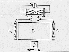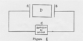 Ad un dato istante la scarica del condensatore (bottiglia di Leida) C va a caricare le placche metalliche A e B. In questo modo il dielettrico D risulta prima polarizzato, quindi depolarizzato ed ancora polarizzato in verso opposto. Se si accetta la teoria di Maxwell ad ogni polarizzazione corrisponde una vera e propria corrente istantanea di spostamento, alla quale dovrà associarsi un campo magnetico con linee di forza concentriche alla direzione della corrente e quindi del campo elettrico (il verso di queste linee di forza cambierà con il cambiamento di verso del campo elettrico). In definitiva, operando in questo modo, si produce un campo elettromagnetico periodicamente variabile e si ha così l’opportunità di vedere come esso agisce sul dielettrico per semplice confronto dell’effetto induttivo con e senza il dielettrico tra le armature A e B.