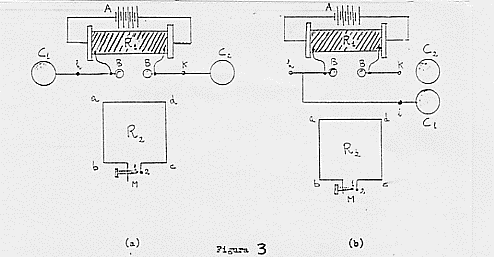 Con il dispositivo di figura 3a, modificato come in figura 3b, Hertz risolse un altro dei problemi che era stato proposto da Helmholtz, anche se non immediatamente connesso con il tema del concorso: dimostrò che le correnti aperte (come quella che ‘circola’ tra k ed i) provocano effetti induttivi. Infatti, anche nel caso del montaggio di figura 3b, si osservano scintille in M e queste scintille sono più intense di quelle rilevate con il montaggio di figura 3a; Hertz interpretò il fenomeno come dovuto alla sovrapposizione degli effetti delle oscillazioni che si producevano nel secondario e della corrente aperta del primario.(18)