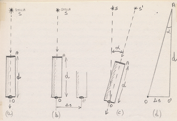 mantenessimo il telescopio in direzione verticale accadrebbe che un raggio di luce , arrivato all’obiettivo A del telescopio, non riuscirebbe a raggiungere l’oculare O dello stesso poiché, nel tempo che la luce impiegherebbe a percorrere il tratto AO, la Terra si e’ spostata (nella sua orbita intorno al Sole) di un tratto Ds. In questo modo la luce proveniente dalla stella, entrata in A, andrebbe a finire su una parete laterale del telescopio, senza raggiungere O, poiché O, nell’istante in cui il raggio sarebbe dovuto giungervi, si trova in O’ (figura 16 b).