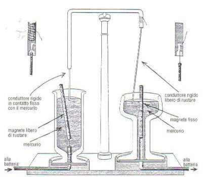 Figura 2 – L’apparato è costituito da due coppe di vetro; all’interno delle coppe vi è del mercurio che permette la chiusura del circuito mediante un contatto strisciante (il conduttore rigido si muove mantenendo il contatto elettrico con il mercurio); i conduttori che escono da sotto le coppe sono collegati ad una batteria; quando passa corrente il magnete della coppa di sinistra ed il conduttore della coppa di destra cominciano a ruotare vorticosamente intorno, rispettivamente, al conduttore fisso ed al magnete fisso.