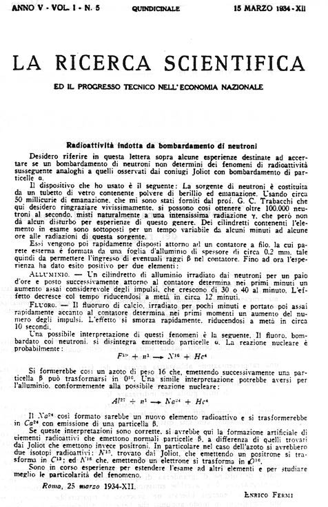LA RICERCA SCIENTIFICAanno V, vol. II, N. 5, 15-31 marzo 1934 Desidero riferire in questa lettera sopra alcune esperienze destinate ad accertare se un bombardamento di neutroni non determini dei fenomeni di radioattività susseguente analoghi a quelli osservati dai coniugi Joliot con bombardamento di particelle alfa. Il dispositivo che ho usato è il seguente: La sorgente di neutroni è costituita da un tubetto di vetro contenente polvere di berillio ed emanazione. Usando circa 50 millicurie di emanazione, che mi sono stati forniti dal prof. G. C. Trabacchi che qui desidero ringraziare vivissimamente, si possono così ottenere oltre 100.000 neutroni al secondo, misti naturalmente a una intensissima radiazione gamma, che però non dà alcun disturbo per esperienze di questo genere. Dei cilindretti contenenti l’elemento in esame sono sottoposti per un tempo variabile da alcuni minuti ad alcune ore alle radiazioni di questa sorgente. Essi vengono poi rapidamente disposti attorno ad un contatore a filo, la cui parete esterna è formata da una foglia d’alluminio di spessore di circa 0,2 mm, tale quindi da permettere l’ingresso di eventuali raggi beta nel contatore. Fino ad ora l’esperienza ha dato esito positivo per due elementi: ALLUMINIO.- Un cilindretto di alluminio irradiato dai neutroni per un paio d’ore e posto successivamente attorno al contatore determina nei primi minuti un aumento assai considerevole degli impulsi, che crescono di 30 o 40 al minuto. L’effetto decresce col tempo riducendosi a metà in circa 12 minuti. FLUORO.- Il fluoruro di calcio, irradiato per pochi minuti e portato poi assai rapidamente accanto al contatore determina nei primi momenti un aumento del numero degli impulsi. L’effetto si smorza rapidamente, riducendosi a metà in circa 10 secondi. Una possibile interpretazione di questi fenomeni è la seguente. Il fluoro, bombardato coi neutroni, si disintegra emettendo particelle alfa. La reazione nucleare è probabilmente:F19 + n1 -> N16 + He4 .
