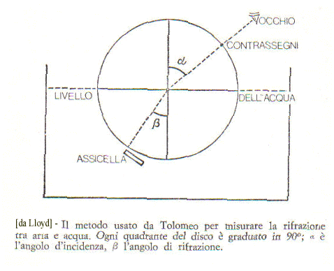 acqua-vetro). Nel passaggio da un mezzo più denso ad uno meno denso (acqua-aria) trova il valore dell’angolo limite. Questo studio origina delle tabelle che sono abbastanza corrispondenti a quelle che possediamo oggi e che gli servirono soprattutto per avere una prova di regolarità di comportamento del fenomeno (per trovare la legge che regola la rifrazione occorrerà attendere i lavori di Snellius del XVI secolo). Riesce poi a stabilire che il raggio incidente e quello riflesso giacciono in uno stesso piano normale alla superficie riflettente. Ed occorre anche ricordare che Tolomeo tentò di spiegare il potere di ingrandimento delle sfere di vetro riempite d’acqua, probabilmente al fine di capire se il fenomeno potesse essere utilizzato in astronomia. Tal cosa diventa sempre più probabile alla luce di scoperte archeologiche: si stanno trovando lenti molto ben lavorate e quindi non più da considerare solo come monili (così si erano interpretati i ritrovamenti di Pompei). Per altri versi sembrerebbe (con tutti i soliti dubbi dovuti alla perdita di lavori ed alla conoscenza di essi attraverso frammenti di citazioni da altri autori) che Tolomeo abbia misurato il diametro di Venere e la cosa sembra impossibile da farsi ad occhio nudo.