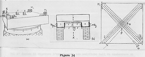 Immediatamente, ancora insieme, Michelson e Morley si misero al lavoro realizzando uno strumento di misura che aveva superato tutti i difetti di quello di Potsdam. Innanzitutto l’intero stramento era montato solidalmente con una grossa base di arenaria (figura 34a) la quale a sua volta era montata su di un galleggiante di legno sistemato in una vasca di ferro contenente mercurio (una sezione dell’intero apparato è mostrata in figura 34b). Il tutto aveva una grossa