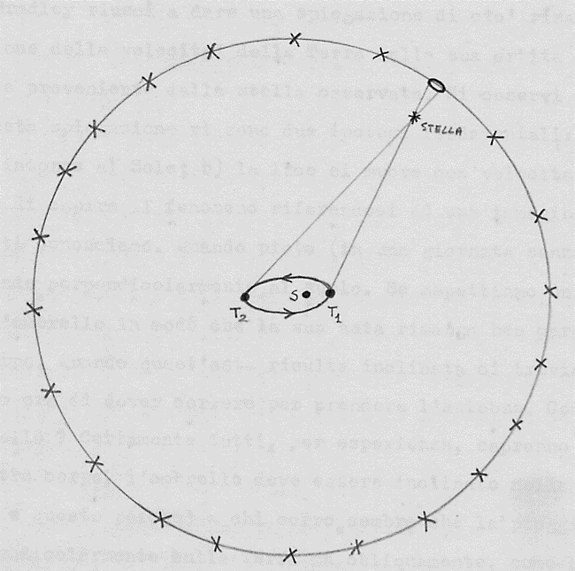 Terra. Si noti che le osservazioni delle stelle venivano fatte, all’epoca, proprio per trovare la parallasse stellare da cui dedurre il moto della Terra intorno al Sole.