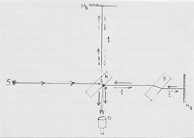 (20) Si noti che in assenza di vento d’etere e nell’ipotesi di bracci perfettamente uguali, in O non si dovrebbe avere nessuna frangia d’interferenza, ma solo una interferenza costruttiva che darebbe il massimo di illuminazione. Ancora in assenza di vento d’etere l’inevitabile disuguaglianza della lunghezza dei due bracci provoca inrterferenza. Qualora ci fosse il vento d’etere queste frange d’interferenza dovrebbero spostarsi quando l’apparato viene ruotato di 90°. Questo era il risultato che si aspettava.