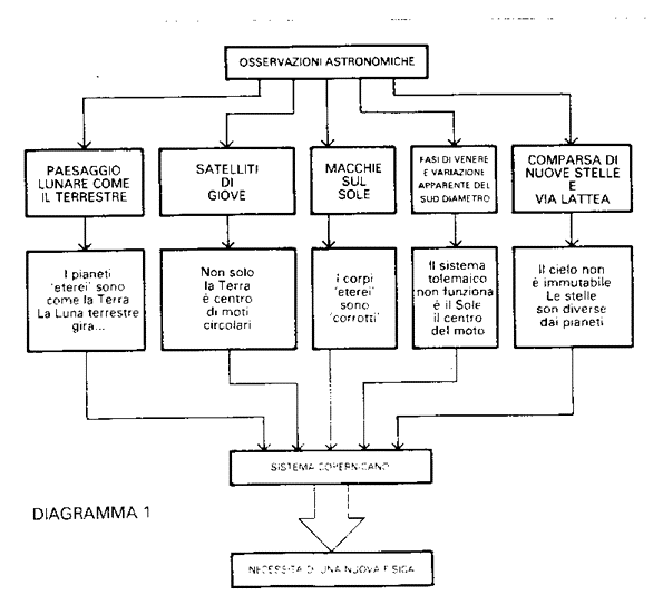 Vediamo come dalle osservazioni astronomiche Galileo trae sostegno per procedere nella costruzione di una nuova fisica (allo scopo sono utili i diagrammi, di flusso 1 e 2).