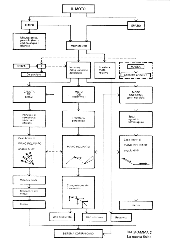 Al contrario, la resistenza del mezzo fa si che oggetti diversi in caduta raggiungano una certa velocità limite; da questo, momento in poi il loro moto diventa uniforme (nella fisica di Aristotele, è l’aria che si richiude dietro un oggetto, che ne permette il moto, il quale è in relazione con la densità del mezzo; nel vuoto non sarebbe possibile alcun moto). Ed è ancora la resistenza del mezzo che impedisce che un dato oggetto in caduta su un dato piano inclinato non risalga alla stessa quota su un piano inclinato contrapposto (l’analogia è con il moto pendolare). Queste considerazioni sono in connessione con un piano inclinato che ne abbia contrapposto un altro con elevazione via via decrescente; ciò, al limite, porta a quel piano inclinato che ha contrapposto un piano orizzontale (Diagramma 2). E, come vedremo, si cominciano a precisare le condizioni del principio d’inerzia.