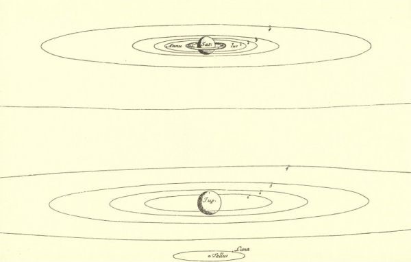 (16) Dopo aver scoperto Titano, Huygens non cercò altri satelliti per un suo strano preconcetto (strano per un uomo come lui che non aveva mai fatto concessioni a numerologie o misticismi vari). Egli era convinto che il numero dei satelliti non poteva essere superiore al numero dei pianeti principali e che, dopo la scoperta di Titano, il sistema solare contava sei pianeti e sei satelliti e quindi era completo.