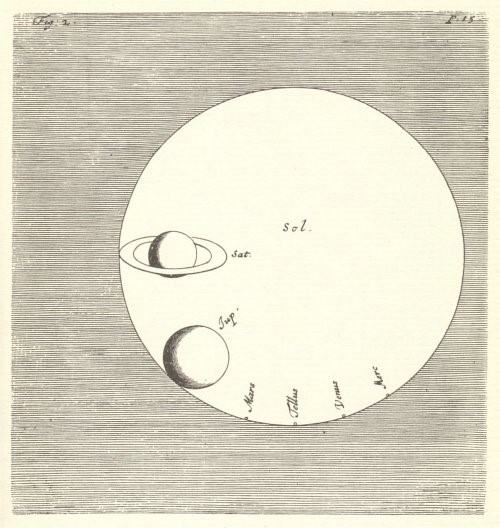 Il Sole, sullo sfondo, a confronto con le dimensioni di vari pianeti. Questa illustrazione proviene dall’ultima opera di Huygens, Cosmotheoros, che discuterò più oltre.