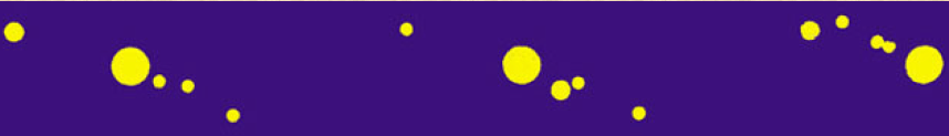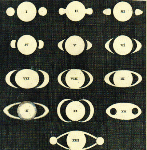 I vari modi in cui poteva apparire Saturno con un cannocchiale come quello di Galileo (bassa risoluzione). Un corpo centrale con due rigonfiamenti laterali.