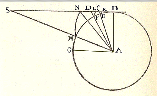 siano presi, sulla circonferenza della ruota, degli archi uguali BE, EF, FM, e sulla tangente BS dei segmenti BK, KL, LN, uguali a detti archi; poiché essendo d’altra parte i raggi EC, FD, MS. Se il globo fosse staccato nel punto B dalla ruota che gira, quando B giungesse nel punto E, il globo sarebbe nel punto K e avrebbe percorso l’elemento EK della curva qui sopra descritta; in capo ad un secondo intervallo di tempo uguale al primo, quando B fosse arrivato al punto F, il globo si troverebbe nel punto L e avrebbe percorso la parte di curva FL. .. Ma queste porzioni di curva devono essere considerate all’inizio della separazione del globo e della ruota come uguali alle rette EC, FD, MS che esse toccano, poiché si possono prendere, a partire da B, degli archi sufficientemente piccoli perché la differenza tra queste rette e gli archi stia, con la loro lunghezza in un rapporto interiore ad ogni rapporto immaginabile.