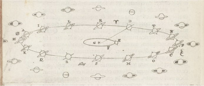 – scopre l’anello di Saturno (data la bassa risoluzione del suo cannocchiale, non vede chiaramente l’anello, ma il pianeta gli appare ‘tricorporeo’);