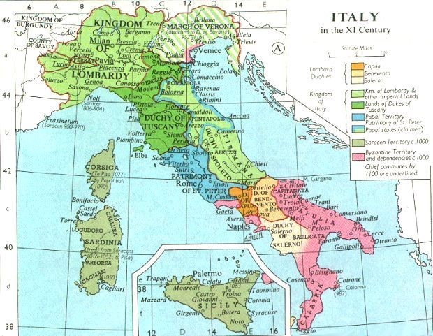 Sul finire del Primo Millennio l’Italia era territorio di conquista per i più differenti eserciti. Risultava frammentata in diversi possedimenti che andavano cambiando abbastanza frequentemente e rapidamente. Alcuni principati, sia al Sud che al Nord d’Italia, si erano fortificati e sembrava dovessero diventare stabili. Vi era poi una forte presenza longobarda a Nord e normanna al Sud. La Chiesa continuava a ricercare il miglior protettore che comunque non doveva discuterne l’autonomia. Il tutto era però diretto da varie potenze straniere, alcune delle quali declinavano ed altre emergevano. Tra queste vi erano le potenze imperiali franca e bizantina, la prima delle quali sostituita o appannata dalla potenza germanica.