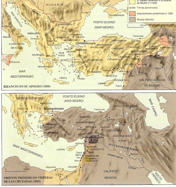 Le due figure mostrano: quella in alto l’estensione dell’Impero bizantino nel 1050; quella in basso la sua estensione nel 1095, quando gli ambasciatori di Bisanzio si recano a Piacenza.