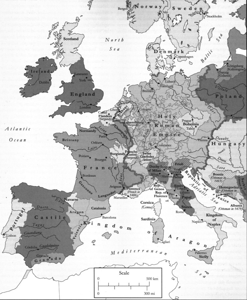 (2) La Spagna, provincia di Roma, nel 409 viene invasa da varie tribù barbare (svevi, vandali, …). Nel 411 i Visigoti vengono in aiuto di Roma e scacciano gli altri barbari. Da questo momento l’amministrazione di questa provincia è lasciata loro. Nel 475, un anno prima della caduta dell’Impero Romano d’Occidente, viene fondato in Spagna il regno Visigoto che, a partire dal 589, sarà interamente cristianizzato. In soli tre anni, tra il 711 ed il 714, gli arabi musulmani del califfato Omeya di Damasco occupano la penisola iberica provenendo da Sud. I cristiani vengono respinti verso nord e lì si attesteranno in piccoli regni situati in posti strategici sulle montagne della cordigliera Cantabrica e dei Pirenei. Nel 756 gli Omeya di Spagna si rendono indipendenti da Damasco e costituiscono il Califfato di Cordova. Questo Califfato si manterrà fino al 1031 per poi smembrarsi in tanti piccoli regni (taifas). A questa data la penisola contava al Nord i regni cristiani di León, Navarra, Aragón, Cataluña (circa un terzo del territorio) una striscia di terra di nessuno divideva questi piccoli regni dai taifas arabi costituenti la regione di ‘Al Andalus‘. La debolezza militare araba avvia, nel 1045, la Reconquista che si concluderà nel 1492. Da sottolineare la conquista cristiana di Toledo del 1085, il formarsi al Nord di tre stati cristiani sempre più grandi ed aggressivi (Portogallo, Castiglia, Aragona e il piccolo Navarra). Dalla metà del XIII secolo il regno di Granada è tutto ciò che resta di arabo nella penisola. Nel 1469 Isabella I di Castiglia sposa Fernando II di Aragona dando inizio alla prima convergenza di regni ispani che in poco tempo occuperà tutta la penisola ed inizierà una impetuosa espansione in altri territori. Nel 1492 cade il regno di Granada, compiendosi il disegno di Fernando e Isabella: unificare i popoli di Spagna in nome della cristianità contro gli invasori arabi. La Crociata è portata a termine vittoriosamente e Papa Alessandro VI Borgia concede ai Re di Spagna il titolo di ‘Re Cattolici‘ (1494).