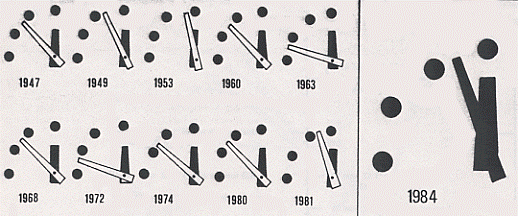Con il 1953 siamo in un periodo in cui la tensione fra mondo occidentale e i sovietici è particolarmente grave; è il solo periodo anzi in cui la tensione è stata più grave di quella che si ha nella fase attuale [1984, ndr.], tanto che il Bulletin of Atomic Scientists, fondato a Chicago nel 1945, da H.H. Goldsmith ed E. Rabinovitch, e che ha costituito la più autorevole e continuativa sede di dibattito dei problemi politici inerenti all’energia atomica, ha spostato le lancette dell’«orologio simbolico del giudizio universale» a due minuti dall’ora zero, inizio del prossimo conflitto nucleare (vedi figura).
