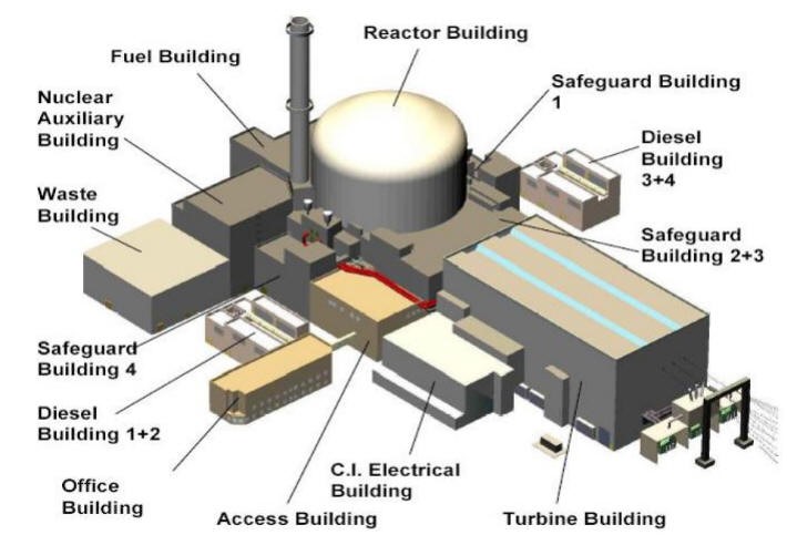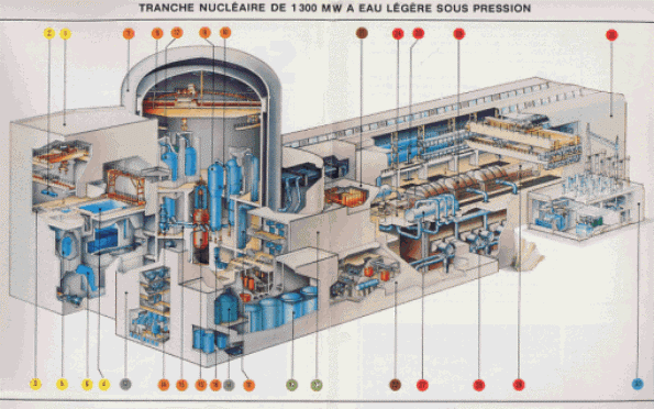 Figura 6. Reattore PWR con tutti gli elementi connessi. Il nocciolo è quello disegnato in rosso sotto la cupola. Iniziando dalla sinistra del disegno: il primo edificio riceve le barre di combustibile nucleare da inserire nel nocciolo che è disegnato in rosso al centro della cupola dell’edificio seguente. Nel primo edificio vengono anche provvisoriamente alloggiate in una grande piscina le barre di combustibile già utilizzate. Sotto la cupola vi sono, oltre al nocciolo, i 4 generatori di vapore (scambiatori) colorati in azzurro. Dalla cupola escono dei tubi che portano il vapore nel grande edificio parallelepipedo che segue. Il vapore entra nella turbina ad alta pressione (indicata con il n° 24) e successivamente nelle turbine a bassa pressione ( n° 25). Queste turbine fanno muovere i generatori di corrente che seguono (n° 26). Da qui la corrente passa ai trasformatori (n° 30) per poi andare nell’elettrodotto. Il vapore che esce dalle turbine a bassa pressione va invece ad essere raffreddato nel condensatore (n° 28) da dove poi torna agli scambiatori nella cupola. In accordo con quanto già detto, a parte il dimensionamento dei singoli componenti, con la sostituzione di quel nocciolo con altro generatore di calore si ha a che fare con altro tipo di centrale termica.