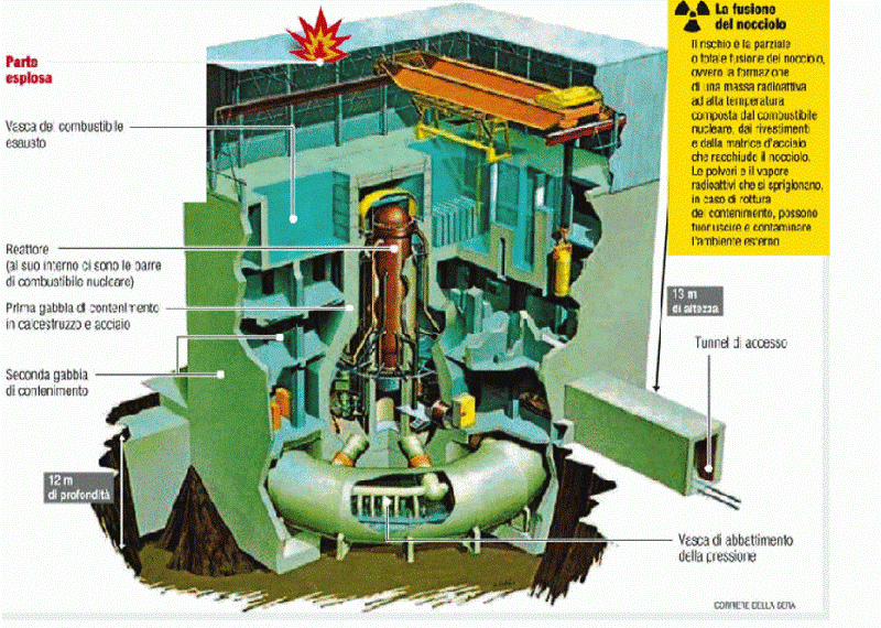 Il campione di queste sciocchezze è un tal Franco Battaglia (in compagnia di una Testa riconvertita a suon di euro) che straparla di nucleare senza capirne un tubo. Ma questo è solo un esempio limite, discusso il quale torniamo a cose serie. Il Battaglia sostenne che la prova che la radioattività non è pericolosa l’hanno fornita proprio i giapponesi che hanno ricostruito Hiroshima e Nagasaki dove le atomiche USA le avevano rase al suolo. Il personaggio, tanto ignorante da meritare ogni apprezzamento da Berlusconi che gli ha fatto una prefazione in un suo sbrodolato libro, deve tener conto di cose fondamentali che, appunto, non conosce. La bomba di Hiroshima era costituita da circa 65 Kg di uranio arricchito, quella di Nagasaki di circa 6,5 Kg di plutonio. Per quanto materiali assolutamente temibili e pericolosi, nell’esplosione, si sono diffusi in un territorio enorme in un’epoca (ricordiamolo) in cui ancora non si sapeva nulla degli effetti delle radiazioni nucleari (tanto che gli USA sperimentavano tali effetti sulla loro stessa popolazione in comunità presenti nel deserto del Nevada). Ma confrontiamo le quantità di materiali radioattivi delle bombe con quelle di centrali nucleari. Una centrale nucleare contiene da un minimo di 160 tonnellate ad un massimo di 400 tonnellate di materiale radioattivo (ricordo che 1 ton = 1000 Kg). Non vi è quindi confronto essendo queste quantità spaventosamente più grandi di quelle delle bombe. Ma c’è di più, molto di più. Una centrale che subisse un incidente ha visto il materiale nucleare al suo interno aver funzionato per un dato periodo. In questo periodo l’uranio arricchito è diventato in gran parte una miriadi di isotopi radioattivi e plutonio (molto più dei circa 6,5 Kg di Nagasaki). Gli isotopi radioattivi sono micidiali dal punto di vista della radioattività e, a fianco di isotopi che in breve tempo smettono di essere pericolosi, ve ne sono di quelli la cui pericolosità si mantiene per centinaia di anni. Tra questi vanno ricordati Iodio 131 e Cesio 137. Gli effetti della radioattività comunque, si manifestano dopo una ventina d’anni e nessuno aspetti di vedere cadere uomini come mosche dopo un incidente.