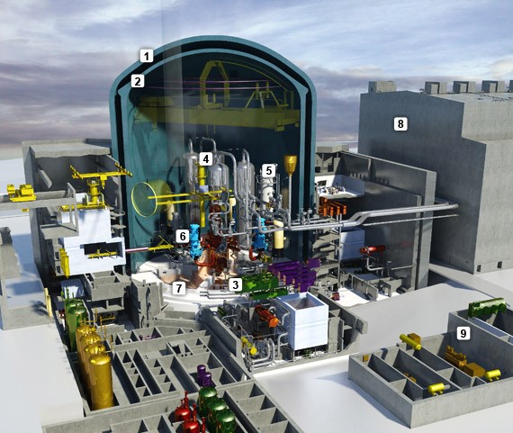 Dentro questo contenitore sono sistemate molte delle funzioni vitali del reattore come i sistemi di raffreddamento, il nocciolo del reattore (3), i generatori di vapore (4), i pressurizzatori (5) e le pompe per raffreddare il reattore (6). Dentro l’edificio di contenzione vi è anche un’area (7) di sicurezza, con disegno speciale, dove far diffondere, raccogliere e quindi raffreddare, mediante circolazione d’acqua sotto il pavimento, i materiali che fuoriuscirebbero in caso di fusione del nocciolo (sistema core catcher o cattura nocciolo: in caso di fusione di esso, sarebbe restato chiuso nell’edificio di contenimento, si veda la figura 11). Vi sono inoltre le piscine dentro cui sistemare le barre esaurite. La turbina, l’alternatore ed i trasformatori sono situati nell’edificio (8) turbine. I generatori diesel sono situati in due edifici separati (9) al fine di avere le maggiori garanzie di loro entrata in funzione in caso di black out elettrico.