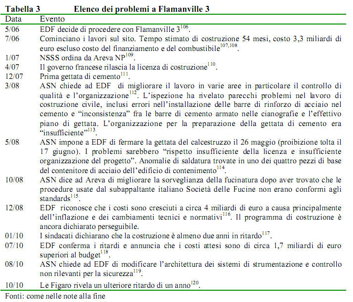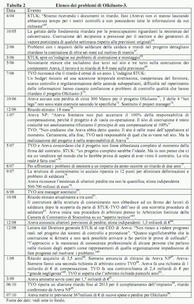 Di queste centrali ne sono in costruzione due, una ad Olkiluoto in Finlandia ed una a Flamaville in Francia (per ciò che riguarda la centrale finlandese c’erano affermazioni da parte dell’Areva che il progetto concorrente AP1000 della Westinghouse non avrebbe soddisfatto i requisiti di protezione contro la caduta di un aereo perché l’edificio di contenimento proposto non era sufficientemente robusto. L’AP1000 non era dotato di un sistema “cattura nocciolo (core catcher)” e il capo dello STUK, Jukka Laaksonen, stabilì che su queste basi l’AP1000 non sarebbe stato accettabile in Finlandia). Vediamo ora i problemi che si sono posti seguendo lo studio di Steve Thomas, L’EPR in crisi che fa un elenco dettagliato dei problemi che si sono posti nelle due centrali in costruzione (lo STUK è l’organismo di controllo finlandese sulla sicurezza; la TVO è l’azienda elettrica finlandese; la CEO è l’organismo che dirige l’EDF, l’ente elettrico francese; l’ASN è l’autorità per la sicurezza nucleare francese mentre la DSIN è l’organismo francese di controllo della sicurezza nucleare più tardi cambiato in DGSNR).