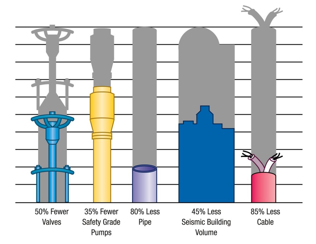 Altro pregio dell’AP 1000 è il disegno complessivo dei macchinari che prevede, oltre all’assenza della ridondanza tipica degli EPR, una struttura più semplificata di ogni componente che dovrebbe servire a diminuire le parti critiche del reattore. L’AP 1000 discende dall’AP 600 ed è un impianto di taglia maggiore, progettato per ridurre il costo del kW/h istallato grazie all’economia di scala. La figura seguente serve a mostrare la diminuzione di vari componenti, spesso soggetti a criticità, in questo reattore: 85% in meno di cavi, 45% in meno del volume degli edifici antisismici, 80% in meno di tubature, 35% in meno di pompe di sicurezza, 50% in meno di valvole.