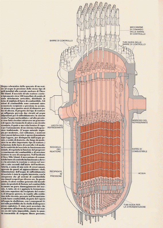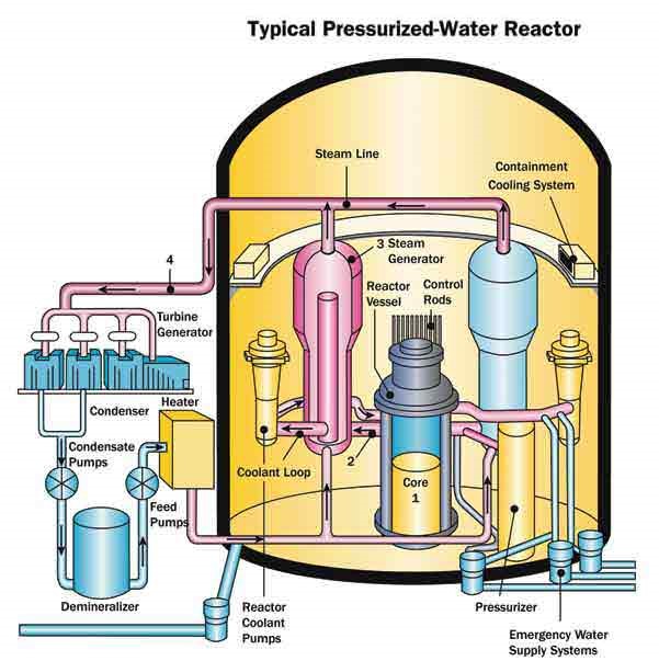 Figura 5 BIS. Disegno schematico di un PWR in cui si apprezza meglio il circuito dell’acqua in pressione che va a scaldare, in uno scambiatore, l’acqua che vaporizzando va alle turbine ed agli alternatori. Nel disegno schematico semplificato dentro l’edificio di contenzione a sinistra vi è il nocciolo ed a destra un solo scambiatore di calore o generatore di vapore. Dentro il nocciolo, in rosso, vi sono le barre di combustibile nucleare (uranio arricchito) e, in nero, le barre di controllo (spesso grafite). In color viola vi è l’acqua ad alte temperatura e pressione che circola in un circuito chiuso. Quando quest’acqua arriva al generatore di vapore cede parte del suo calore e torna, aiutata da una pompa, all’interno del nocciolo. Questa funzione è indispensabile oltre che per fornire energia anche per raffreddare il nocciolo che altrimenti diventerebbe fonte di gravissimi problemi. Il generatore di vapore è invece alimentato da acqua circolante in un circuito separato da primo. Osservo che oltre al generatore di vapore, vi è anche un cilindro bianco tra il generatore di destra ed il nocciolo. Tale cilindro è il pressurizzatore che svolge un ruolo fondamentale: serve a mantenere l’acqua del circuito di raffreddamento del reattore (circuito primario) ad una pressione sempre elevata e tale da non mandarla in ebollizione. La pressione del vapore viene regolata scaldando o raffreddando l’acqua del pressurizzatore che, a sua volta, viene utilizzata per regolare la pressione dell’acqua di raffreddamento del reattore. L’acqua che si trova nel generatore di vapore (circuito secondario), scaldata da quella del primario, diventa vapore che è inviato per muovere le turbine che vanno a generare energia elettrica. Nella figura seguente si può apprezzare che per un solo nocciolo vi sono 4 scambiatori di calore.