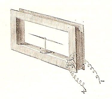 Uno dei primi sistemi ideati da Ampère per studiare le azioni elettrodinamiche tra correnti (bilancia di Ampère). Il conduttore AB è fisso mentre il lato BC della spira BCEF è mobile potendo oscillare lungo l’asse EF, mantenendosi parallelo ad AB. Questa bilancia e le successive mostrate provengono dalla prima memoria di Ampère sulla spiegazione dell’esperienza di Oersted (Mémoire sur les effets des courants électriques, 1820).