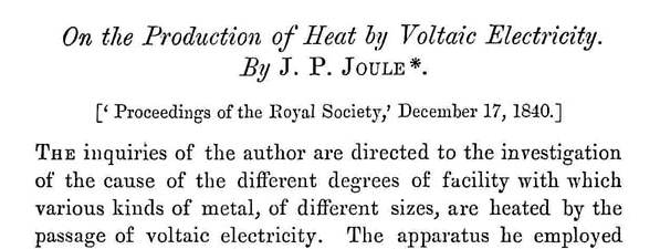 Sempre del 1840 è il suo primo lavoro di grande rilievo. Si tratta della memoria On the Production of Heat by Voltaic Electricity, pubblicata sui Proceedings of the Royal Society, December 17, 1840.