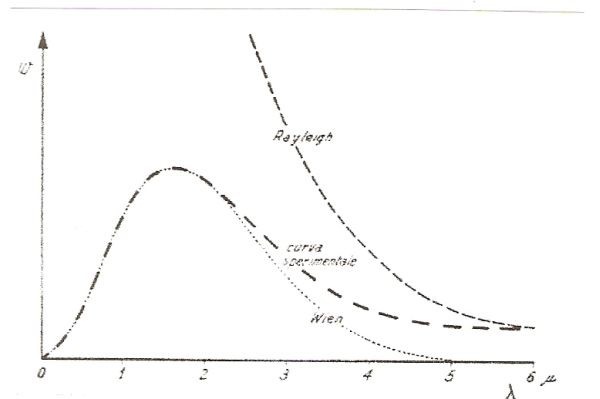 Confronto tra dati sperimentali e teorie del corpo nero. L’emissione di energia secondo la legge di Rayleigh aumenta continuamente al diminuire della lunghezza d’onda (o aumenta continuamente all’aumentare della frequenza) mentre, secondo l’esperienza essa è massima, per una data temperatura, in corrispondenza ad una determinata frequenza.