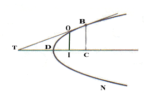 figura in cui è riportato il segmento parabolico ABC. Consideriamo il punto medio D di AC. Da esso tracciamo l’asse BD della parabola e prolunghiamolo fino ad intersecare in E la tangente CF alla parabola in C. Tracciamo poi la parallela AF a BD passante per A, intersecante in F la tangente CF. Consideriamo ora la retta che parte da C e passa per il vertice B che poi intersecherà AF nel punto K. Su tale retta prendiamo il punto K tale che risulti HK = KC. Si consideri ora una retta qualunque MO parallela ad EBD. Dice Archimede che, poiché CBA è una parabola, poiché CF è ad essa tangente e CD è la metà della corda parallela alla tangente in B, vertice del segmento parabolico (o: la metà della corda coniugata al diametro BD,come diremmo oggi), ne consegue che EB = BD per quanto dimostrato da Euclide (in una parabola la sottotangente di un punto qualsiasi è divisa per metà dal vertice). Per lo stesso motivo e per il parallelismo tra FA ed MO risulta anche MN = NO e FK = KA. A questo punto Archimede fa riferimento ad una proporzione che egli stesso aveva dimostrato in Quadratura della parabola:
