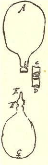Per pesar l’aria, io piglio un fiasco di vetro AB, grande come la testa d’un huomo incirca, il quale nel collo habbia la strozzatura B, per potervi legar fermamente un ditale di cuoio CD; il qual ditale nel mezo habbia un’animella da pallone ben fermata, per la quale con uno schizzatoio caccio molt’aria nel fiasco AB, havendolo prima pesato in una bilancia esatta; e dopo havervi compressa molt’aria per forza, la quale in virtù dell’animella resta carcerata, torno a pesare il fiasco e trovolo notabilmente più grave: e però salvo appartatamente il peso che bisogna aggiunger di più, il quale vien a esser il peso dell’aria straniera.