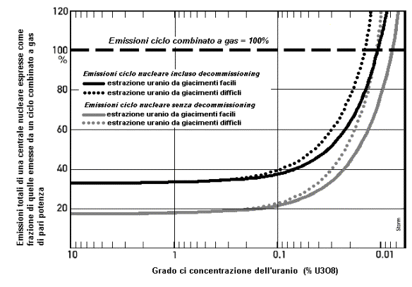 Ma per la valutazione, complessiva, delle emissioni di CO2 risulta cruciale la considerazione della concentrazione di uranio nel minerale dei giacimenti che vengono sfruttati: è evidente infatti che se per ottenere 1 Kg di uranio da un giacimento con concentrazione dello 0,1% occorre estrarre e lavorare una tonnellata di materiale, ne occorreranno 10 volte di più per ottenere lo stesso quantitativo di uranio se la concentrazione del giacimento è pari allo 0,01%; altrettanto evidente è che le caratteristiche del giacimento di uranio influenzano la convenienza ad estrarlo in termini economici, ma soprattutto fisici. Secondo uno studio quantitativo [Jan Willem Storm Van Leeuwen e Philip Smith, “Facts and data: Is nuclear power sustainable; would its use reduce CO2 emissions?”, 2003, 2005, http://www.elstatconsultant.nl/; aggiornamento del febbraio 2008, http://www.stormsmith.nl, con il riferimento ai rapporti precedenti] il limite fisico oltre il quale l’energia necessaria ai processi di estrazione e lavorazione dell’uranio supera quella ottenibile dal suo impiego nei reattori si raggiunge per giacimenti con un grado di concentrazione compreso tra 0,03 – 0,04% di uranio. L’andamento delle emissioni di una centrale nucleare come frazione di quelle di una centrale in ciclo combinato a gas è riportato dagli autori nella figura seguente, in cui si vede che anche attualmente raggiunge il 35 % (che non è zero!), ma per concentrazioni inferiori allo 0,1% la curva diverge e l’emissioni emesse raggiungono e superano quelle dell’impianto a gas. Naturalmente si può non essere d’accordo con questo studio, ma vista la sua impostazione rigorosa bisogna per lo meno contestarlo nel merito.