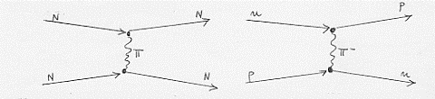 Il diagramma di Feynman dell’interazione tra. due nucleoni (N) è il seguente (l’altro diagramma rappresenta una particolare interazione tra nucleoni, tra un n ed un p):
