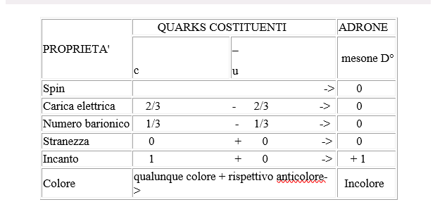 Per quel che riguarda l’incanto c’è solo qualcosa da dire. Questa proprietà, per molti versi analoga alla. stranezza, fu introdotta nel 1974 per spiegare alcune particolarità di una nuova particella allora scoperta, il mesone J (o y), da Ting e Richter (indipendentemente). Questa particella. aveva una vita media superiore più di 1000 volte a quella di un comune adrone (ed in questo senso poteva essere pensata simile ad una particella strana ma il fatto che il suo spin fosse intero, valesse cioè 1, la collocava tra i mesoni) inoltre (e questa era la cosa che colpiva di più) aveva una massa insolita.mente grande, più di tre volte quella del protone. Cercando di costruirla con i quarks allora disponibili, u d s, ci si accorse che era impossibile. Fu allora che si introdusse il quark c dal sapore incanto. Prendendo in considerazione una particella incantata, ad esempio il mesone D° (che non abbiamo mai incontrato), troviamo la seguente composizione a quarks: