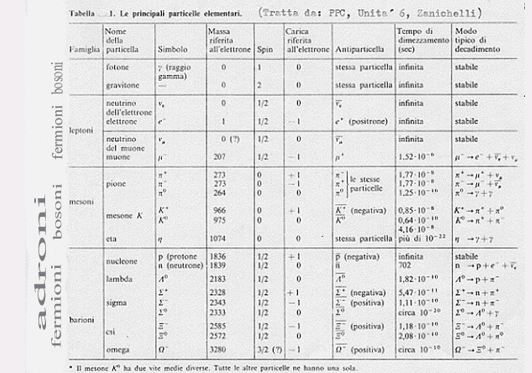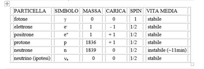 E’ utile, a questo punto, organizzare in una tabella, tutte le particelle più importanti con le quali avremo a che fare (vedi tabella seguente). Come si può vedere, le principali particelle sono raggruppate in 4 famiglie a seconda delle loro proprietà.