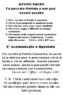 Pio XII ricorse allora a quello che riteneva un rimedio estremo: la bolla di scomunica contro comunisti, socialisti, loro alleati, simpatizzanti, elettori, lettori della loro stampa, insomma contro tutti coloro che non fossero disposti a considerare la sinistra come una banda di appestati.