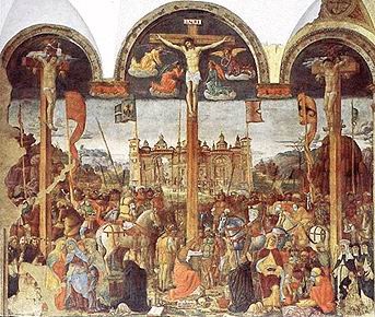 Se vogliamo trovare Maria Maddalena è proprio a questa parete che dobbiamo guardare, volgendo le spalle all’Ultima Cena di Leonardo. Il Cristo si erge solitario, nella croce centrale. Alla sua sinistra ecco il gruppo delle tre Marie che sorreggono Maria, la Madre del Signore. Alla destra della croce troviamo Giovanni, l’evangelista. Tra gli astanti tante figure della storia dell’ordine domenicano, insieme ai presenti all’atto della crocifissione – commistione che indica la contemporaneità di tutti i viventi all’opera salvifica del Cristo. La Maddalena è là, ai piedi della croce. Non l’innamorata del Signore, ma colei che abbraccia la croce del Figlio dalla quale il perdono stesso del Padre si riversa sul mondo.