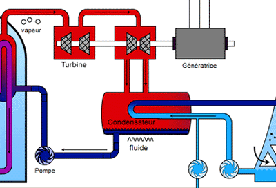 viene utilizzata per muovere la seconda turbina. Le turbine muovono degli alternatori che generano la corrente elettrica. Ma questa parte non interessa ora. Il vapore è ancora ad alta temperatura (zone rosse di figura) e deve essere raffreddato prima di essere inviato di nuovo nel generatore di vapore mediante delle pompe. Per raffreddare si usa il sistema chiamato condensatore che serve proprio a riportare il vapore allo stato liquido mediante altra acqua prelevata dall’ambiente esterno (fiume, lago, mare). L’acqua esterna che entra nel condensatore esce a temperatura elevata e necessita di essere raffreddata prima di essere rinviata da dove era stata prelevata ed a questo servono le torri di raffreddamento.