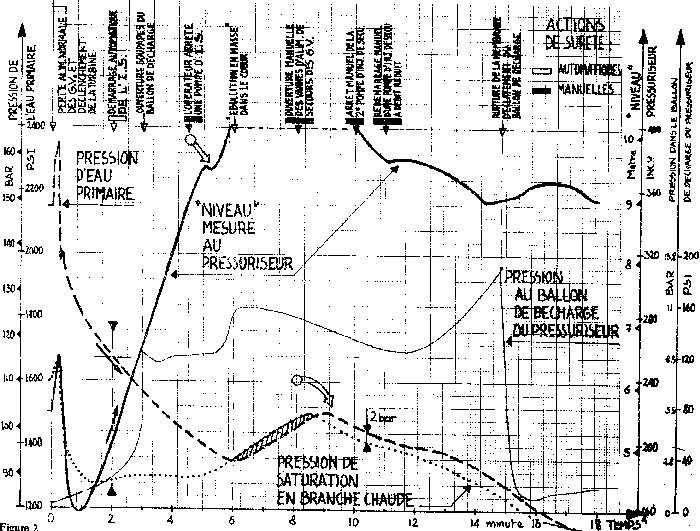La temperatura dell’acqua del primario che si elevava bruscamente comportò un suo aumento di volume. Conseguenza di ciò fu che il livello dell’acqua nel pressurizzatore salì a scapito di quello del vapore che risultava compresso nella parte superiore del pressurizzatore medesimo e che la pressione lì dentro salì al valore di 2255 psi(2), oltre 100 psi sopra la norma. Questo eccesso di pressione, come previsto dal progetto, fece aprire automaticamente nel pressurizzatore la valvola comandata di sicurezza (PORV o Pilot-Operated Relief Valve, indicata con il n° 10 in Figura 1) per scaricare vapore ed acqua dal circuito primario che sarebbero poi andati nel pozzo di raccolta (n° 17 di Figura 1) e quindi, mediante pompe, nel deposito esterno (n° 6 di Figura 1) all’edificio di contenzione.
