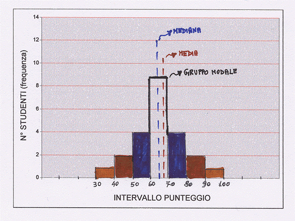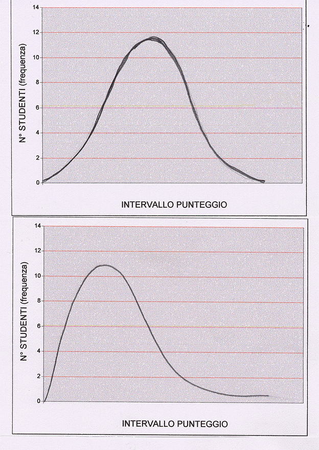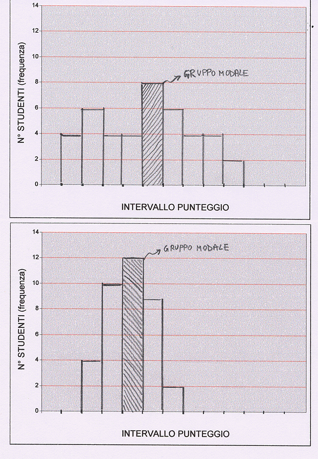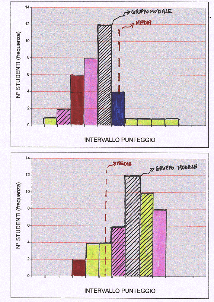 La media al di fuori del gruppo modale ci informa di qualche anomalia nella classe. O studenti in grave ritardo (media in basso) o studenti con conoscenze molto superiori (media in alto). Naturalmente qui discende anche il feed-back di cui dicevo prima. E’ possibile che il lavoro dell’insegnante non sia adeguato. E’ possibile che il test fosse superiore alle capacità di quel gruppo, ma è anche possibile che fosse troppo facile. Queste considerazioni faranno intervenire l’insegnante con ulteriori spiegazioni e serviranno via via a calibrare il test medesimo.