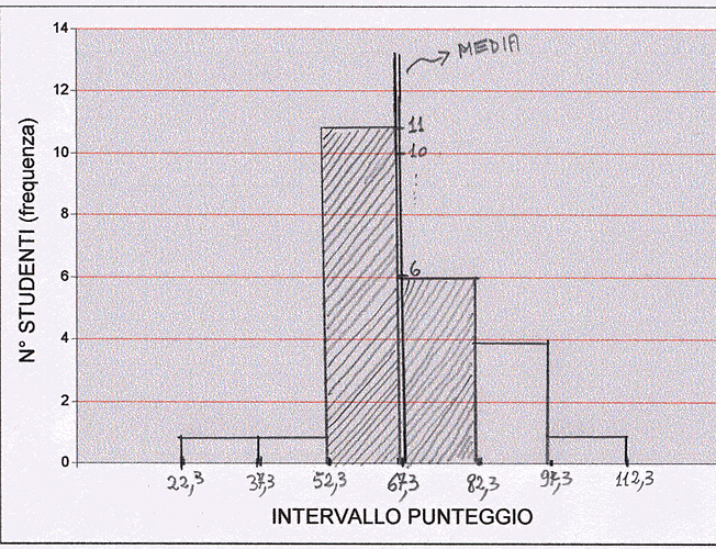- Si fa quindi un istogramma che ha la media come asse centrale (cioè: 67,3) ed a destra e a sinistra i punteggi sopra calcolati. Nel nostro caso si ottiene che tra 67,3 e 52,3 vi sono 11 studenti; tra 67,3 e 82,3 vi sono 6 studenti; e così via.