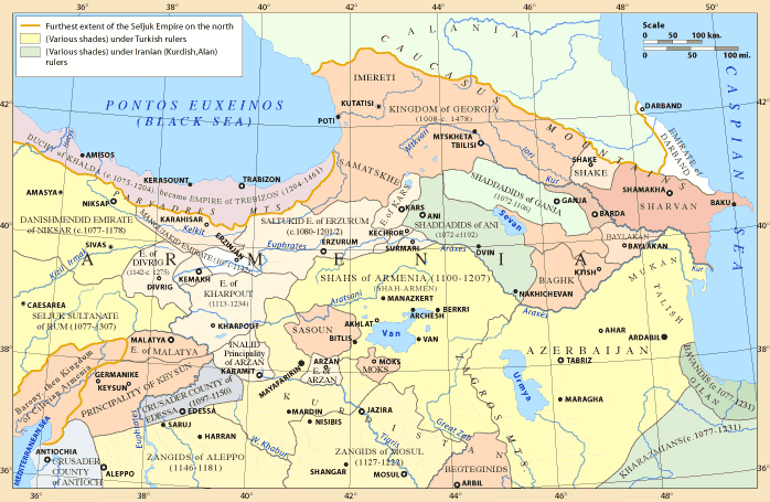 Questa carta rappresenta il riassunto della situazione (shah vuol dire regno). Gli Artuqidi o Ortoqidi sono una dinastia turca (non Selgiuchide) che governava la regione nella quale si trovava Mardin. La dinastia fu fondata da Artuk o Ortuk nella seconda metà dell’XI secolo e, alla morte di Artuk nel 1091, i territori di Jezireh da lui governati passarono per metà al figlio Soqman (tra cui la città di Diyarbakır) e l’altra metà al figlio Ilghazi (tra cui le città di Mardin e Mayyâfâriqîn o Silvan). Il nipote di Soqman I, Soqman II di Armenia figlio di Dhahir-eddyn Ibrahim, diventerà sultano della Persarmenia. Dove troviamo scritto Sultanate of Rome ci si riferisce al Sultanato di Rum o di Iconio.